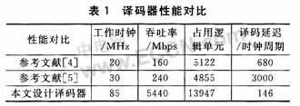 与参考文献相比,由于本译码器采用了并行结构在增加了不到3倍的硬件资源的情况下,吞吐率时钟比(吞吐率/时钟)提高了8倍,而且缩短了3/4的泽码延迟。与参考文献相比,本文所采用的译码器增加了不到3倍的硬件资源,提高了8倍的吞吐率时钟比。由于参考文献采用串行译码结构,本文所采用的并行流水译码结构较串行译码结构缩减了19/20的译码延迟。