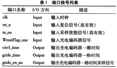 硬件电路板测试完成后,需要设计FPGA硬件模块实现数据采集。模块各端口列表,如表1所示,信号采集仿真波形,如图2所示。输出信号中所有光电编码器时间是系统时钟个数的计数值。最后通过软件模块计算得到平均扭角、瞬时扭角以及误差。