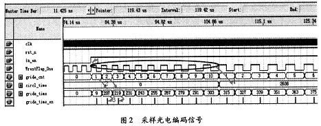 如图2所示,当in_en高有效时,在WrestFlap_one上升沿,寄存器gride_cnt加l,同时gride_time,circl_time开始计算。当下一个WrestFlap_one上升沿时,寄存器gride_cnt加1,直加到一圈格数,然后又重新开始重复的计算。同时当下一个WrestFlap_one上升沿时gride_time输出计算了上一圈的光电编码器一格时间。当gride_cnt一圈数完时,circl_time输出上一圈的总时间。在WrestFlap_one下降沿,gride_en输出使能采样信号,高有效,此信号做为后端FIFO写使能信号。(图中椭圆区域为一圈光电编码信号的输出,仿真中规定一圈有10格,第1格对应的gride_time是207,第2格对应的gride_time是219…。)