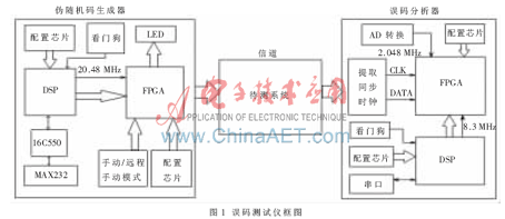 本文所述的误码测试仪是基于DSP和FPGA实现的,具有更大的灵活性,升级方便,例如可以方便地改变测试序列的码元速率,本误码测试仪是以常用的2.048 MHz的码元序列为例进行的测试,理论上可以实现0"160 MHz测试码速率。如果硬件升级,理论上还可以达到更高的码速率,还可以在需要的情况下增加另外所需的测试码型。误码测试的主要工作由FPGA完成,系统的稳定性较高。其系统框图如图1所示。