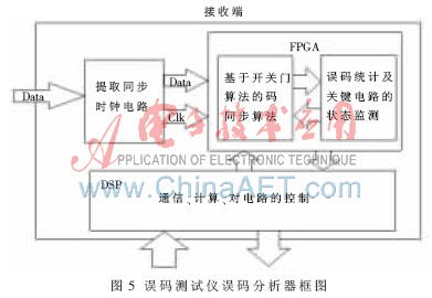 如图5所示,整个误码分析器的系统结构可以分为三大部分: (1)从接收到的二进制码序列中提取同步时钟,此部分由专用芯片及其外围电路完成;(2)利用m序列开关门同步算法完成码同步,并进行误码统计和采集电路关键部分的状态信息,上报给DSP,此部分主要由FPGA及其外围电路完成,FPGA核心模块的工作框图如图6所示,误码测试的时序图如图7所示;(3)DSP完成与其他设备的通信和对电路控制。