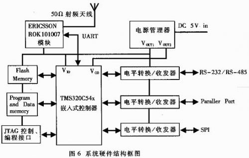 (2)嵌入式控制器由TI的定点数字信号处理器TMS320C54x、Flash Memory、SRAM组成,完成对蓝牙模块的初始化、数据传送、协议实现等功能。
