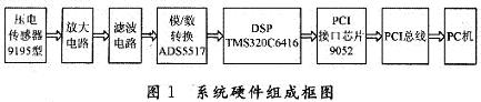 基于TMS320C6416动态称重系统的硬件设计主要包括:压电石英式传感器、放大电路模块、滤波电路模块、模/数转换模块、TMS320C6 416信号处理模块、存储器模块、PCI接口模块、电源电路模块组成,其组成框图如图1所示。