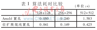 耗时测试实验目的是验证位扩展混沌算法的时效性。Arnold算法在图像尺寸为128×128、256×256、512×512的周期依次为96,192,384,分别设定密钥为50、100、200;位扩展算法的密钥设为a=1.952,x0=0.143,则结果如表1所示。