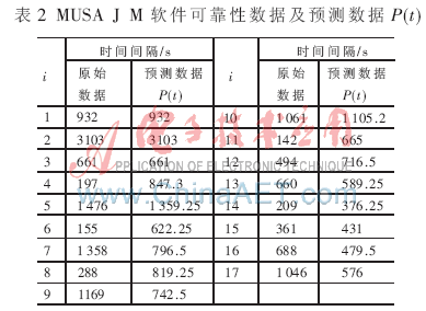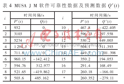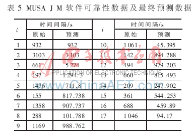 由于前5个失效数据点的预测Q′(t)缺少有效的数据,所以计算ESS时,将其剔除,剔除后的点求得RE的值为1.23,相对于使用未经处理的点获得的RE值(1.595)误差减小近20%。同时,可以看到其产生误差的主要原因是失效数据点11所导致的。MUSA J M软件可靠性数据及最终预测数据如表5所示。