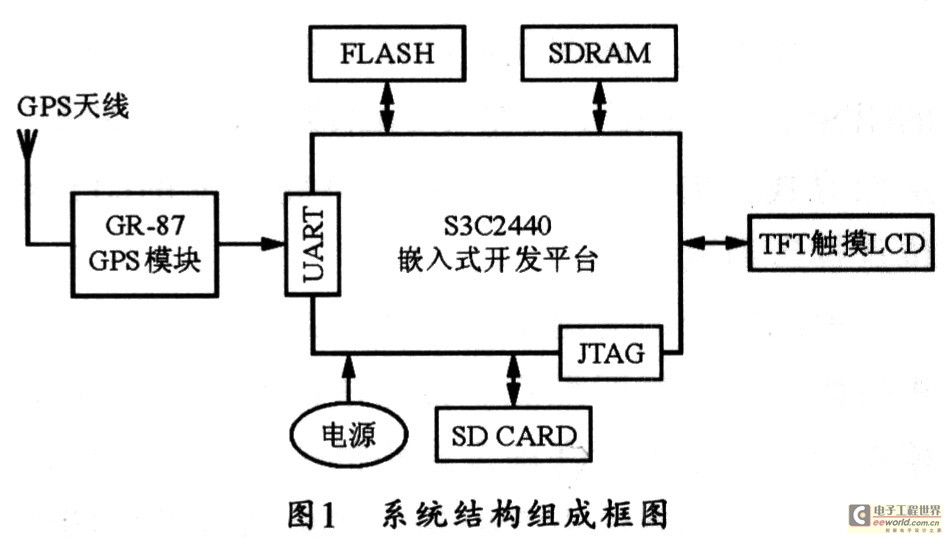 本文所介绍的GPS全球定位导航系统按功能可分为嵌入式主控模块、GPS模块、显示模块、扩展模块及供电模块等五大部分。