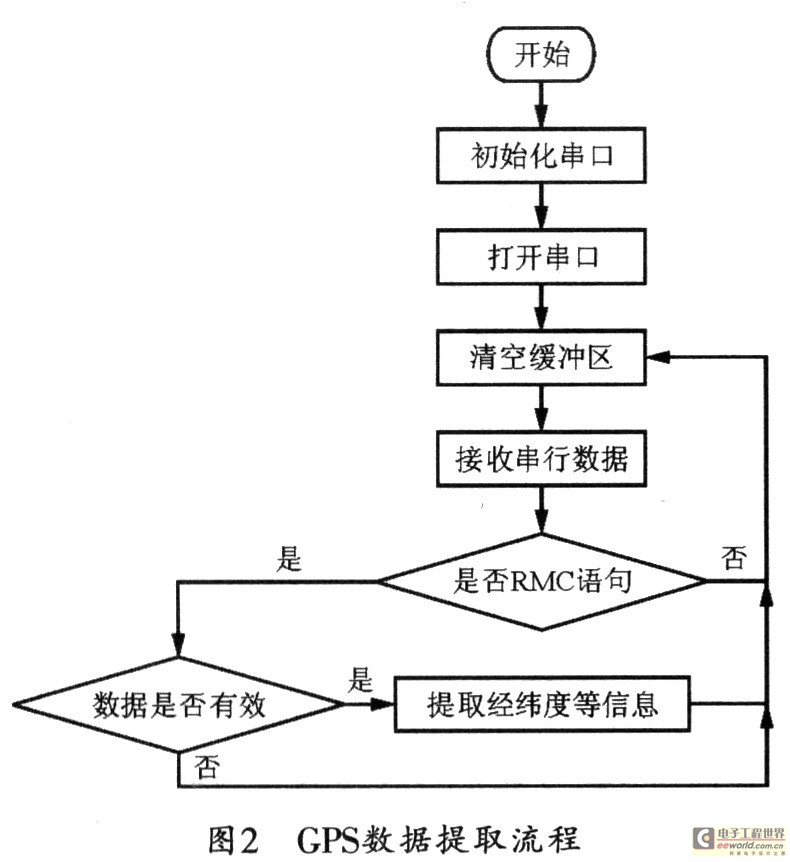 GR-87型GPS模块的输出语句遵循NMEA-0183标准。该标准的语句都是以“$”开始,以<CR><LF>结束。 “$”之后是5字符地址,头两个字符为发送者识别码(GPS为“GP”),后3位为语句名称。定位信息中的数据由“,”来划分。GPS模块一般每秒可以输出一次NMEA-0183格式语句。在导航系统中,一般只需要用到时间、日期、经纬度、速度。而由于RMC语句完整包含了系统所需的上述信息,因此。只需要对RMC语句进行提取即可。图2所示是对GPS数据进行提取的具体流程。