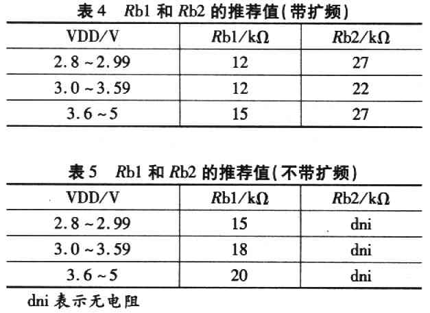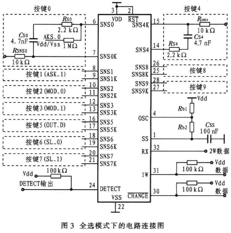 QT1101在全选模式下的电路连接图如图3所示,QTll01的内部振荡器是通过连接在OSC和SS引脚上的外部网络实现的,所给出的推荐值是由标称工作电压和扩频模式来决定,如表4和表5所示。如果没用扩频时,只用电阻Rb1,无需电容CSS,SS引脚通过100 kΩ的电阻连到VSS。