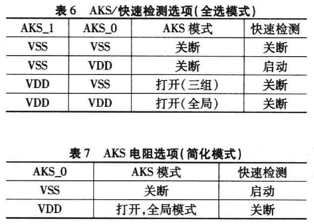简化模式不需要大量的可选电阻,该模式是通过在引脚SNS6K和SNS7之间连接电阻进行设置的,在该模式下,只有一种选择是可用的——AKS使能或禁止。当AKS禁止时,可工作在快速检测模式,而当AKS使能时,不能工作在快速检测模式。而且AKS在该模式下只能是全局方式工作,也就是作用在全部的功能按键上。