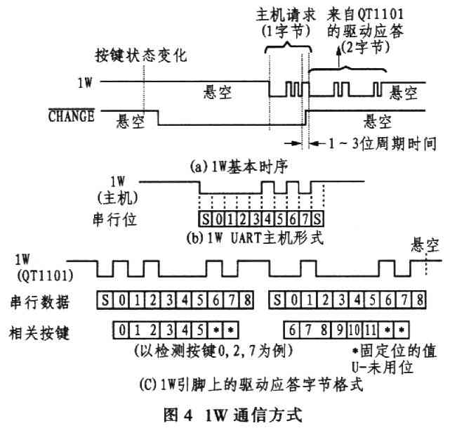 串行1W接口是基于RS-232的自动波特率串行异步接口,它只需要主机MCU和QTll01之间的一根接线,串行数据短并且容易理解。1W总线是双向的,其串行工作的基本时序如图4(a)所示。