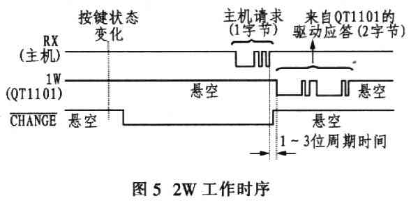 如上所述,1W总线工作中,当等待QTll01的应答时,主机应悬空1W总线,但是,这样一般是不可能实现的。为了解决这个问题,QTll01也可以从主机通过RX引脚来接收字符“P”,而与1W引脚分离开来,如图5所示。由于QTll01从不驱动RX,主机不用悬空RX。