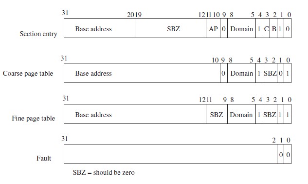 ARM MMU硬件采用2级页表结构:一级页表(L1)和二级页表(L2)。一级页表只有一个L1主页表(L1 master page table)。L1主页表包含两种类型的页表项:保存指向二级页表起始地址指针的页表项和保存用于转换1MB段的页表项。L1主页表也称为段页表(section page table)。L1主页表将4GB的地址空间划分为多个1MB的段(section),因此L1页表包含4096个页表项,L1主页表是一个混合表,可作为L2页表的页目录,也可作为用于转换1MB虚拟空间的L2粗(coarse)页表或L2细(fine)页表的指针;当L1页表用于转换一个1MB的段时,其页表项(PTE)包含的是物理存储器中1MB页帧(page frame)的首地址。目录页表项和1MB的段页表项可以共存于L1主页表。