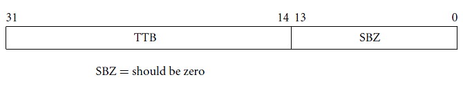 CP15:c2寄存器保存转换表基地址TTB(Translation Table Base address)-指向L1主页表在虚存中的位置。CP15:c2寄存器的格式如图:
