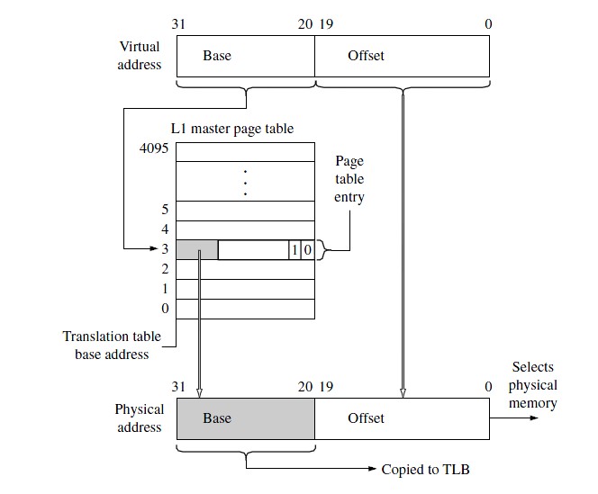 如果MMU搜索的是1MB大小的段页,则硬件能用单步搜索找到所要的页表项,因为1MB的页表项是存放在L1主页表里的。