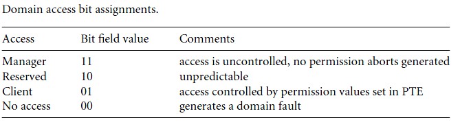 有两种不同的控制用来管理一个任务的存储器访问权限,:域(domain)用于主控制(primay control),页表中的访问权限用于次控制(secondary control)。有16种不同的域可以分配给虚存的1MB段,并通过设置L1主页表项(PTE)中的域的有关位(位域)来分配给一个段。