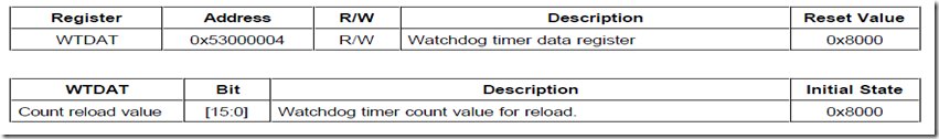 WTDAT用于确定超时期限。WTDAT的内容在最初的定时器操作时不能自动加载到定时器计数其中。但使用0x80将驱使第一次超时,在这种情况下,WTDAT的值将自动载入WTCNT。