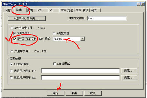 在打开的话框中,选择“输出”选项卡,在这个选项卡中,“E生成HEX文件”选项前要打勾,按“确定”退出。