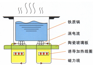 电磁炉是应用电磁感应原理对食品进行加热的。电磁炉的炉面是耐热陶瓷板,交变电流通过陶瓷板下方的线圈产生磁场,磁场内的磁力线穿过铁锅、不锈钢锅等底部时,产生涡流,令锅底迅速发热,达到加热食品的目的。