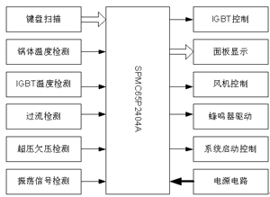 系统采用SPMC65P2404 作为主控MCU,主要模式有:键盘扫描,锅体温度检测,IGBT 温度检测,电流过流检测,超压欠压检测,振荡信号检测,风扇控制,数码管显示控制,LED 控制,蜂鸣器控制,系统启动控制。