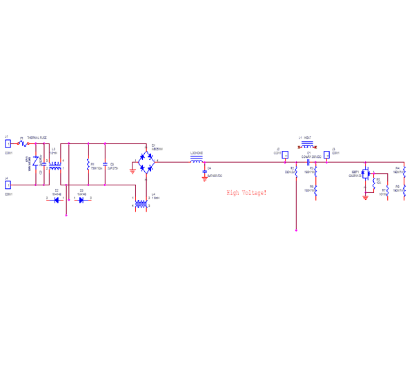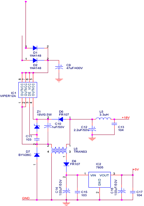 开关电源部分采用TI 公司最新推出的集成电路VIPer12A,来实现不同电压的输出,AC 接入后经过半波整流,接到VIPer1