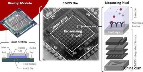 InSilixa的DNA测试芯片采用IBM 250nm制程制造,成本约30-50美元。它利用每个分子传感器约100um的32x32数组。制造该芯片的挑战之处在于多级芯片封装制程。