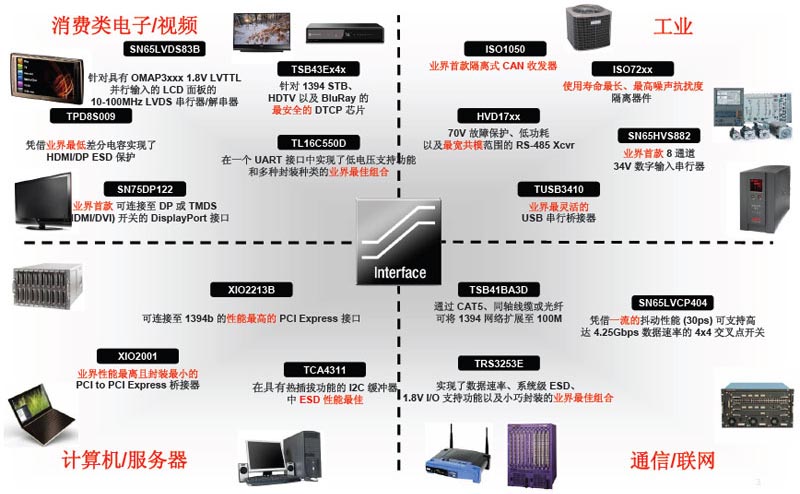 接口产品市场很大。虽然今年有一个下行低潮,但明年的预计还是非常好。TI提供所有接口类产品,包括电信、网络、工业,甚至是医疗应用。TI不管从哪个角度、哪个应用领域来看,都可以提供非常完善的产品系列。虽然接口类产品竞争激烈,但TI的市场份额仍能达到五分之一以上。TI接口产品的应用范围如下图所示。
