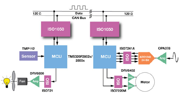ISO1050基本实现两个作用:一个是实现CAN接口类的电气特性控制,另外一个是把隔离的器件结合在一起。之前至少要两片芯片才能完成同样的功能,现在ISO1050可以用一片来实现。除了隔离的CAN以外,之前TI也推出很多产品,如隔离的485。485和CAN是工业应用比较多的串行总线方式,都需要有一个隔离技术芯片,这是系统级的应用场合。