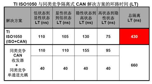 另外,从CAN本身的传输特性来看,CAN的基本特性是一根总线上放很多接口,是多主方式,每一个接口都可以当作主来发送接收。所以每个接口本身的反应时间,会影响到整个总线的反应速度。传统方式下需要一个隔离芯片外加一个接口芯片。ISO1050只是一个芯片。一个芯片的响应时间比两个要快,大从而大提高了总线的反应速度。