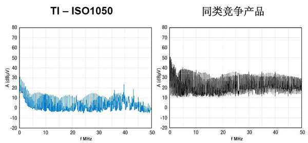 隔离的电磁环境也叫电磁干扰、电磁辐射。下图显示,ISO1050产生的电磁干扰大大降低,接近同类产品的二分之一到三分之一。在工业领域环境敏感的情况下,这种特性非常重要。