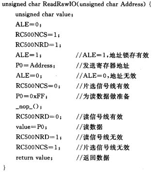 在软件设计中STC11F32和MFRC500之间的模拟通信是最关键的一步,因为只有打通了底层通信的关键环节,STC11F32才能进一步通过控制MFRC500实现读、写卡的基本操作。为了实现这一步,首先要弄清楚MFRC500的读写时序。本设计采用的是独立读/写选通、复用地址总线的方式,在此方式下MFRC500的读写时序如图2所示。