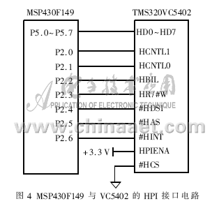 TMS320VC5402提供一个HPI主机接口。HPI是一个8位并行口,用来与主设备或主处理器接口,HPI作为一个外设与主机相连,使主机的访问操作很容易[3]。