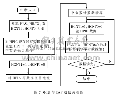 系统主程序流程图如图5所示。上电后首先DSP进入引导程序并开始系统的初始化,然后,为了使串口能配合AD73360开始工作,要对DSP的 McBSP串口进行设置,包括对字长、允许产生中断等的设置。开始工作后串口的时钟由AD73360产生,接着由设置好的串口对A/D进行初始化,打开六路采样通道,设置采样模式等。然后打开INT0等待中断。INT0由PLL电路产生,由此实现同步采样。DSP收到INT0后,打开发送中断向A/D发送采样指令,并同时打开数据接收中断开始接收数据,采样后对数据进行FFT谐波分析以及处理后的数据传送与显示。数据采集流程图如图6所示,MCU与DSP 通信流程图如图7所示。