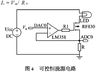 集成运放LM358 内部包括2 个独立的、高增益的、内部频率补偿的运算放大器,具有高增益、失调电压影响小、3~30 V 的宽电源电压范围,且可用作电压跟随器。运放配合MOSFET RF830 通过反馈跟随输入电压V in ,功率MOSFET 的基极与运放的输出级相连,用来增加驱动电流。当LM358 的同相端输入电压恒定时,由于负反馈的存在,保证了LM358 输出电压恒定,从而使流经LED 负载的电流为恒定电流。本设计是在0~30 V 电源供电的条件下,调节电流源的输入电压V in 从0~2. 4 V 变化,控制恒流源电路得到0~2. 4 A 的电流输出,由此可计算采