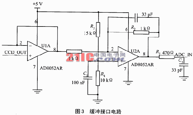 在设计ADC接口电路时,要注意以下一些问题。首先,由于LTC1402内部输入信号的“保持-采样”电路的速率达到80MHz,所以,外部的噪声和干扰都可以通过LTC1402的输入端对A/D转换产生影响。根据LTC1402数据手册的要求,我们解决的方法是,在LTC1402的输入端加上一阶的滤波电路,将输入信号的频率限制在一定的范围内。其次,CCD的输出对于外界的阻抗变化比较敏感,如果将ADC的输入端与CCD的输出直接相连,则 CCD的负载可能随ADC输入端内部阻抗的变化而变化。基于以上两点考虑,我们在CCD和ADC之间设计了缓冲电路,用于阻抗匹配和滤波。缓冲接口电路如图3所示。