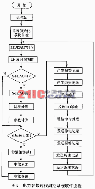 电力参数远程测控系统的软件包括系统初始化、时间读取与时段判断程序、电力参数计算、通信命令处理、产生各种历史及报警记录、显示状态等模块。软件流程如图5所示。