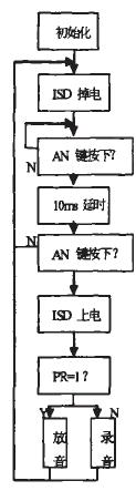 此系统中主程序采用软件延时去除按键抖动。我们在程序中设置了三个按键,分别为复位键,状态键和执行键。为了节省能源,在利用按键判断系统不进行录散音操作时,语音芯片进入掉电状态。ISD4002芯片通过SPI接口写入数据。主程序主要完成对按键信息的判断.如果有键按下则调用相应的子程序。
