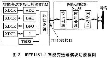 从IEEEl451.2标准开始,传感器被划分为变送器模块和网络适配器模块两部分,两模块在接口形式上为IEEEl451.1实现模型(见图1)提供了具体的研究示例。IEEEl451.2标准规定了一个连接传感器到微处理器的数字接口,并对变送器电子数据表格 TEDS(TransducerElectronic Datasheet)及其数据格式进行了详细描述;通过提供一个连接智能变送器模块和网络适配器模块的10线标准接口TII,实现传感器在多种网络中的 “即插即用”,从而体现出其“独立”和“兼容”的特点。值得注意的是,该标准并没有对信号调理和信号转换部分进行规定,这样使得传感器制造商可以继续使用自己原本的生产技术,保持各自在该行业中的竞争力。图2为IEEEl451.2智能变送器模块的功能框图。