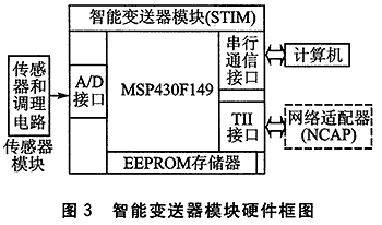 TI公司生产的16位单片机MSP430F149作为智能变送器(STIM)的微控制器,外围电路主要包括A/D接口、TII接口、RS一 232串行通信接口以及基于I2C总线协议的EEPROM存储器。图3为硬件设计的基本框架。图中传感器模块独立于STIM模块,二者通过A/D接口相连接。虚线部分为网络适配器模块,这里不对网络适配器模块的相关内容进行介绍。