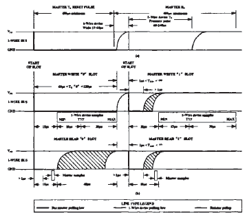 由于1-Wire总线只有一根信号线.所以要完成通信就要在一根信号线上实现数据的双向传输。1-Wire通信协议对时序的要求非常严格。协议中一共规定了五种类型的通信时序,分别为初始化(复位)时序、写"1"时序、写"0"时序、读"1"时序和读"0"时序.如图1所示。所有通信都由这五种典型时序组合完成.就是说要控制好这五种时序.才能实现对1-Wire器件的控制。