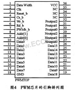 PWM芯片的引脚排列如图4所示,当其在上电加载时钟后,所有通道都禁止输出。系统通过采样DataWidth来确定外围数据接口的宽度,如果采用16bits传输(DataWidth=1),则Data[15:0]都使用;如果采用8bits传输 (DataWidth=0),则仅使用Data[7:0],而将高8bits接地。