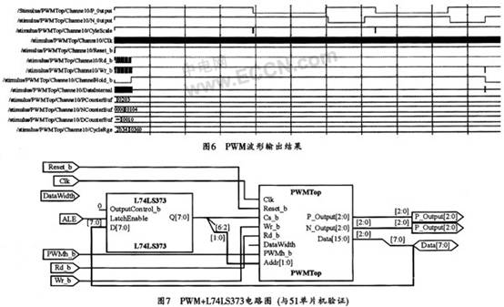 PWM的FPGA验证可采用8 bits数据接口,并用89C51做外围控制器(12 MHz)来对PWM进行操作。为了方便与单片机的接口,可将74LS373锁存器内置到PWM中,其整个数字部分设计如图7所示。