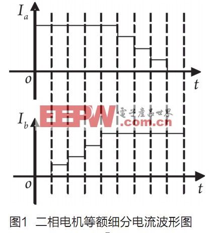 步进电机的驱动方式有多种,如恒电压、恒电流等多种形式。而这些方式都存在一定的缺陷,特别是在低速运行时的振动大、噪声大和在步进电机自然振荡频率附近运行时易产生共振,且输出转矩随着步进电机的转速升高而下降等缺点。为了改变上述缺陷,本文采用了额定电流可调等角度恒力矩细分驱动方案。该方案最主要的优点是:步距角变小,分辨率高,提高了电机的定位精度、启动性能和高频输出转矩,减弱或消除了步进电机的低频振动,降低了步进电机在共振区工作的几率。一般细分驱动只改变相应绕组中电流的一部分,电动机的合成磁势也只是旋转步距角的一部分,绕组电流不是一个方波而是阶梯波,额定电流是台阶式的投入或切除,如图1所示。
