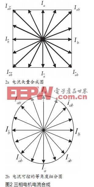 其合成的矢量幅值是不断变化的,输出力矩也跟着不断变化,从而会引起滞后角的不断变化。当细分数很大、微步距角非常小时,滞后角变化的差值已大于所要求细分的微步距角,使得细分失去了意义。据此分析,采用建立数学关系同时改变两相电流,即Ia和Ib以某一数学关系同时变化,保证变化过程中合成矢量幅值始终不变。建立一种“额定电流可调的等角度恒力矩细分”驱动方法,以消除力距不断变化引起滞后角的问题。这种合成矢量幅值保持不变的数学模型为:当 Ia=Imcosx,Ib=Imsinx时(式中Im为电流额定值,Ia、Ib为实际的相电流,x由细分数决定),其合成矢量始终为圆的半径,即恒力距; 等角度是指合成的力臂每次旋转的角度一样;额定电流可调是指可满足各种系列电机的要求;细分为对额定电流的细分(如图2a和2b所示)。