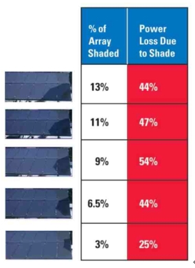 图2:遮蔽条件下电池板阵列的性能差异.(来源:《阴影对连接电网的PV系统的影响》)