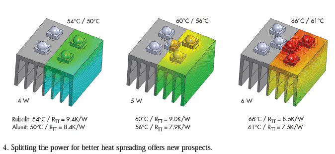 这是一种灵活的方法,可用于不同目的。你可以选择使LED工作在其最佳温度以确保LED的长寿命及更高的每瓦流明数;也可以选择接收较高工作温度带来的使用寿命和效率降低。50℃到110℃是常见的温度范围。若需要更高流明,5或6W LED可配备4W散热器。用几个1W LED分摊功率有助于改进散热:65℃对应5W;70℃对应6W(图4)。