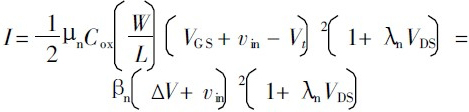 这里,n 是跨导参数,vin是输入信号,!V = VGS - Vt是过驱动电压,n 是沟道长度调制系数,Vt 是阈值电压。根据( 1)式可得输出电流: