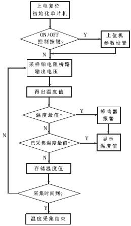 下位机主要负责温度采集。首先用户通过上位机软件来设定温度采集的开始时间、采集时间间隔以及报警温度等各个参数,然后开始采集温度数据。采集时显示最值温度,当温度超出报警温度值时,蜂鸣器发出报警信号。下位机程序的流程图如图4所示。