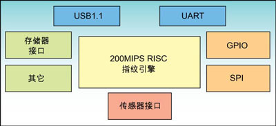 根据目前指纹识别市场的发展,上方电子公司(BEYONDLSI)开发出了专用指纹识芯片FCHIP2(结构见图1)。该芯片具有非常高的运算性能,其内嵌有上方电子的指纹比对算法程序,这种算法具有多种优秀的特性,例如精度高、在面积型传感器上指纹在360°任意方向都可以识别、指纹模板数据小等。该算法已经申请专利。 FCHIP2指纹芯片的主要特点如下:内嵌200MHz指纹比对引擎;片内64KB SRAM;具有USB1.1、UART、SPI接口;具有与指纹传感器的接口;通用16位接口;FBGA 144脚封装;体积:10×10×1.26mm;3.3V供电。指纹比对参数:FAR<0.01%;FRR<1%;比对速度<1.5s。 FCHIP2芯片内植入了与富士通公司的MBF310、MBF200,台湾祥群科技(LighTuning)公司的LTT-SS500,以及上方电子公司的BL-FO180B等四种型号指纹传感器相挂接的驱动程序。在后续产品中将继续植入与其它型号指纹传感器相挂接的驱动程序。