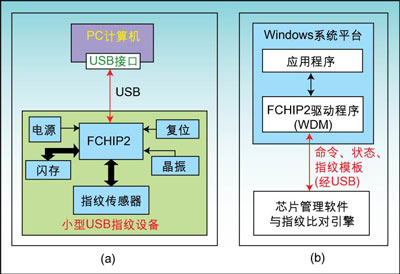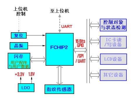 图2(a)是该方案的硬件结构框图,图2(b)是软件结构图。这个与PC相连接的USB指纹设备具有广泛的应用范围。例如,PC系统的登陆与注册;各种需要验证身份的应用程序的调用;网络安全身份认证等等。总之,凡是在PC中需要输入密码的应用场合都可以在接入本设备后,在应用软件的配合下,使用指纹身份认证来代替密码。 产品模块方案。用户可使用FCHIP2设计一个小型模块作为产品销售或作为自己产品、工程的组成部分。如图3所示使用FCHIP2设计的一个小型模块。该模块与上位机通讯一般使用UART接口。 芯片嵌入方案。用户也可将FCHIP2直接嵌入到自己的控制系统之中,其嵌入与控制结构见图4。 单芯片小系统控制方案。这是一个充分发挥FCHIP2的潜力的使用方案。在这个方案中FCHIP2除担任指纹比对功能外,还可直接介入到用户的控制任务中。FCHIP2的设计人员在设计时考虑到了用户对于这个芯片的二次开发应用。