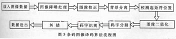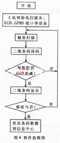 整个系统软件部分大致分为设备初始化、条码图像采集、译码、条码内容显示、数据输出等几部分。软件流程图见图6。